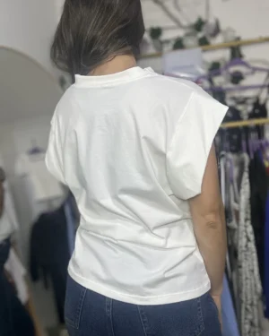Blusa con cuello alto y espalda descubierta, en color blanco con estampado de lunares negros pequeños.
