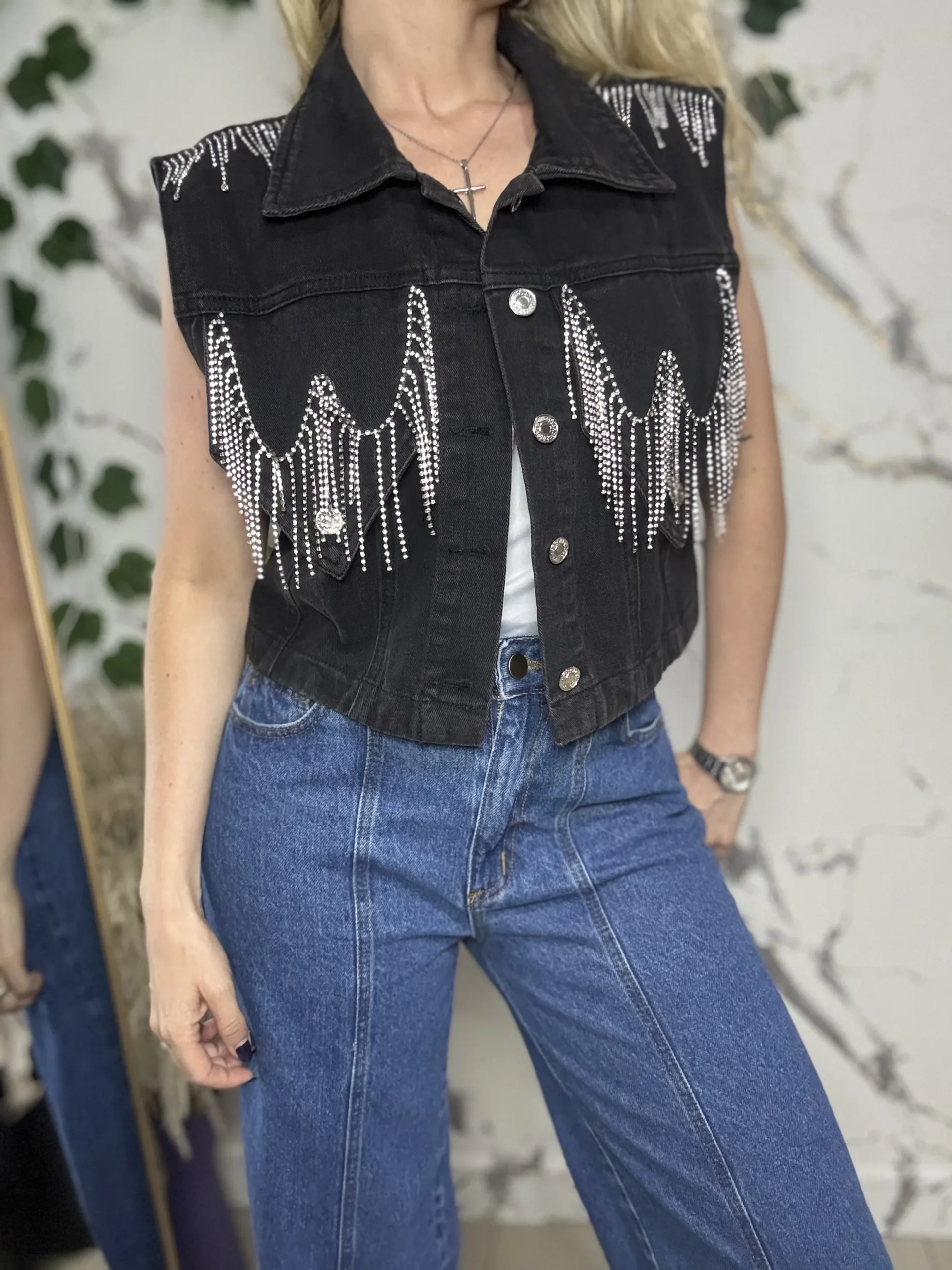 Chaleco en material denim con detalle brillos talla única