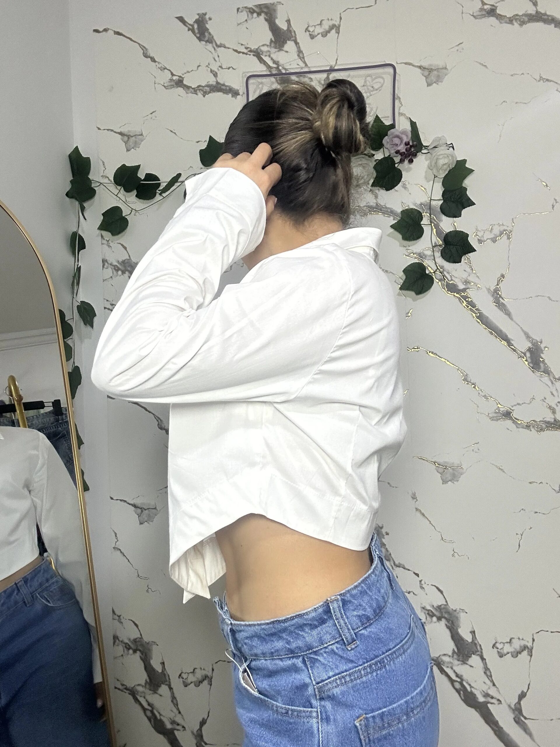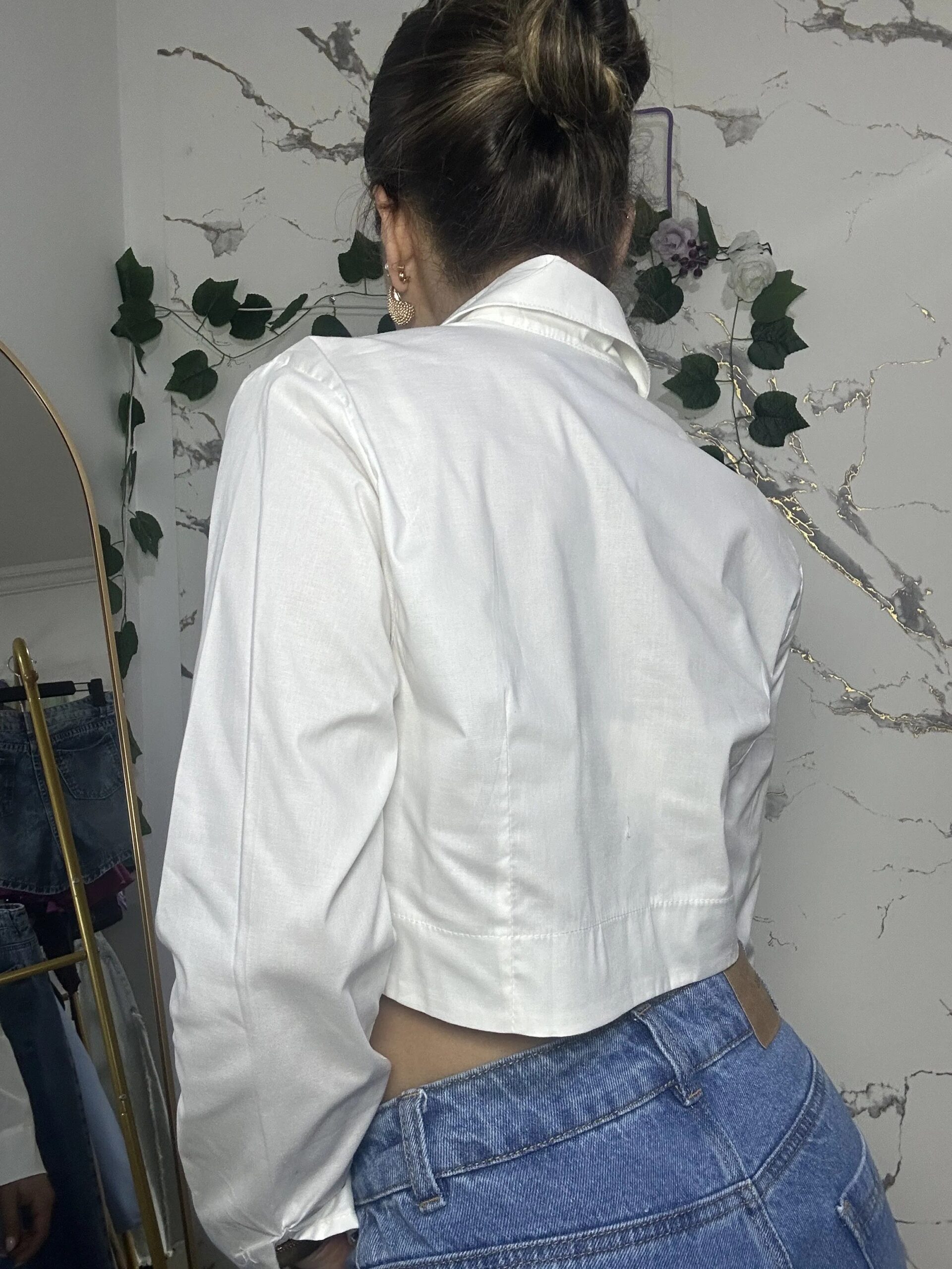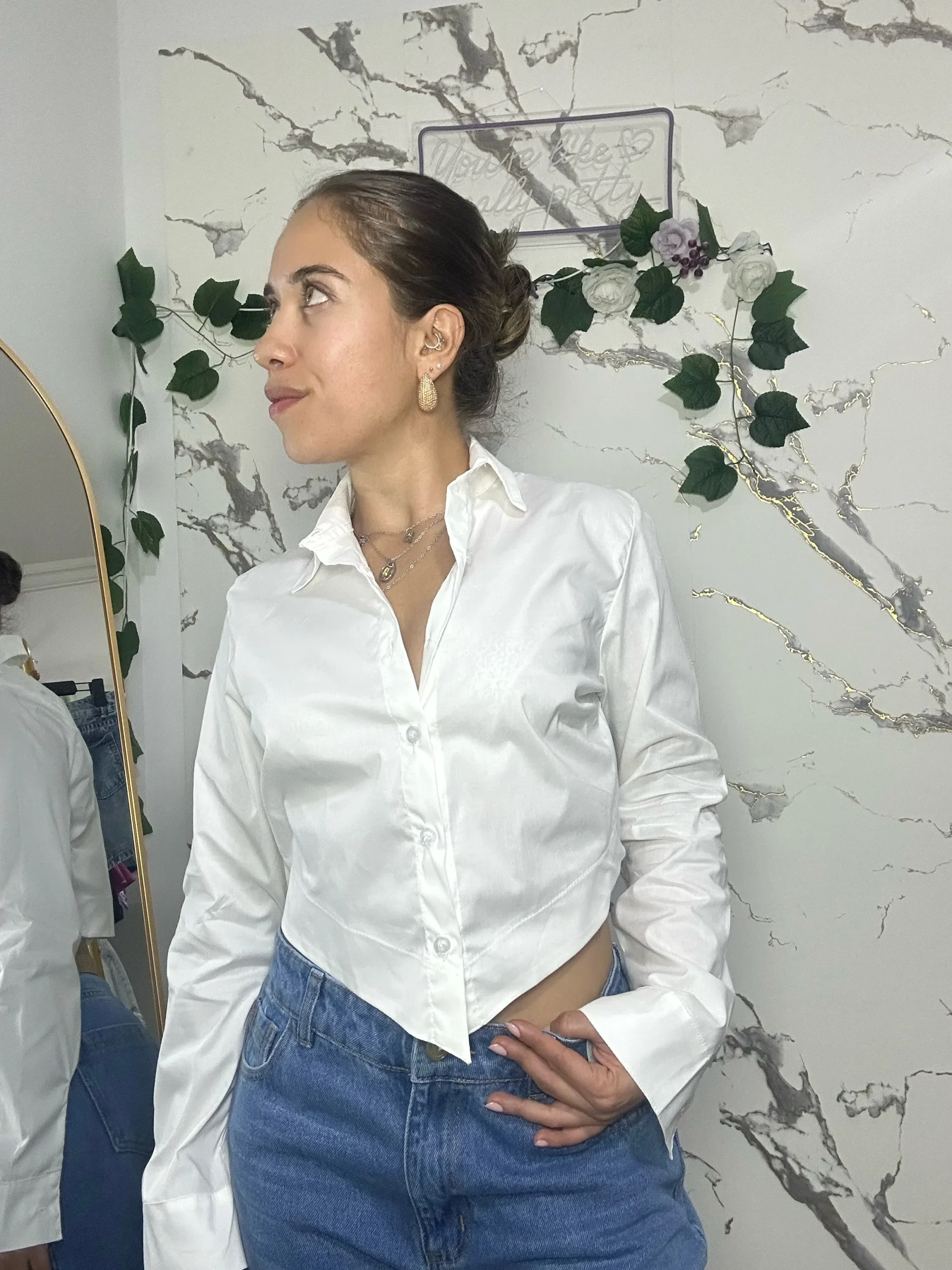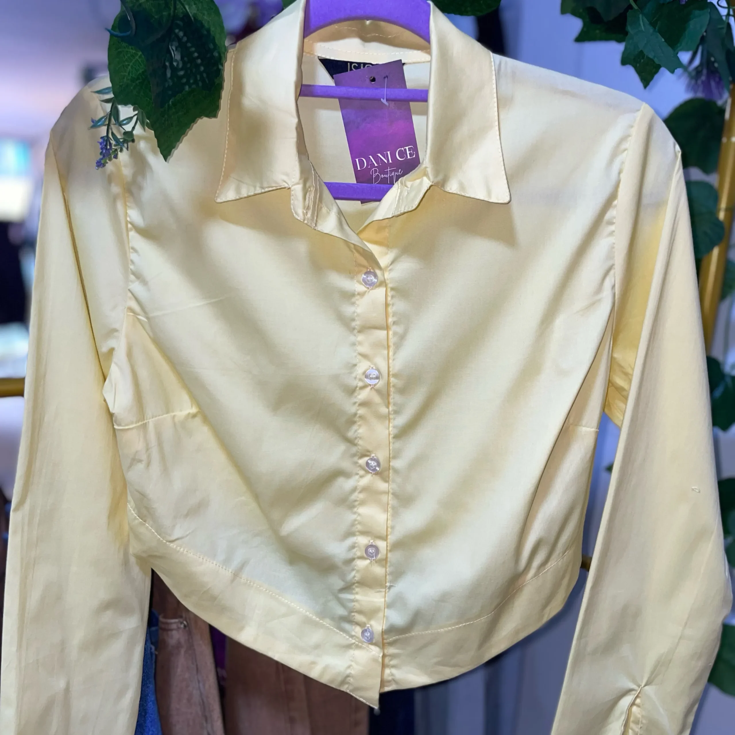 Elaborada en popelina, tela ligera, fresca y de estructura firme. Diseño cropped con punta en la parte delantera que estiliza la silueta, cierre frontal con botones y mangas largas.