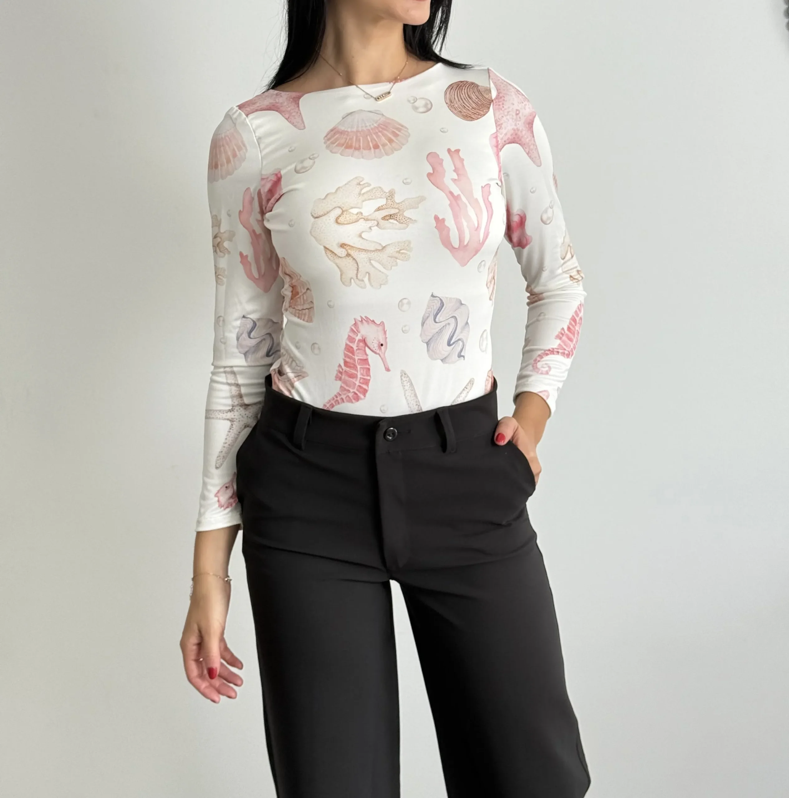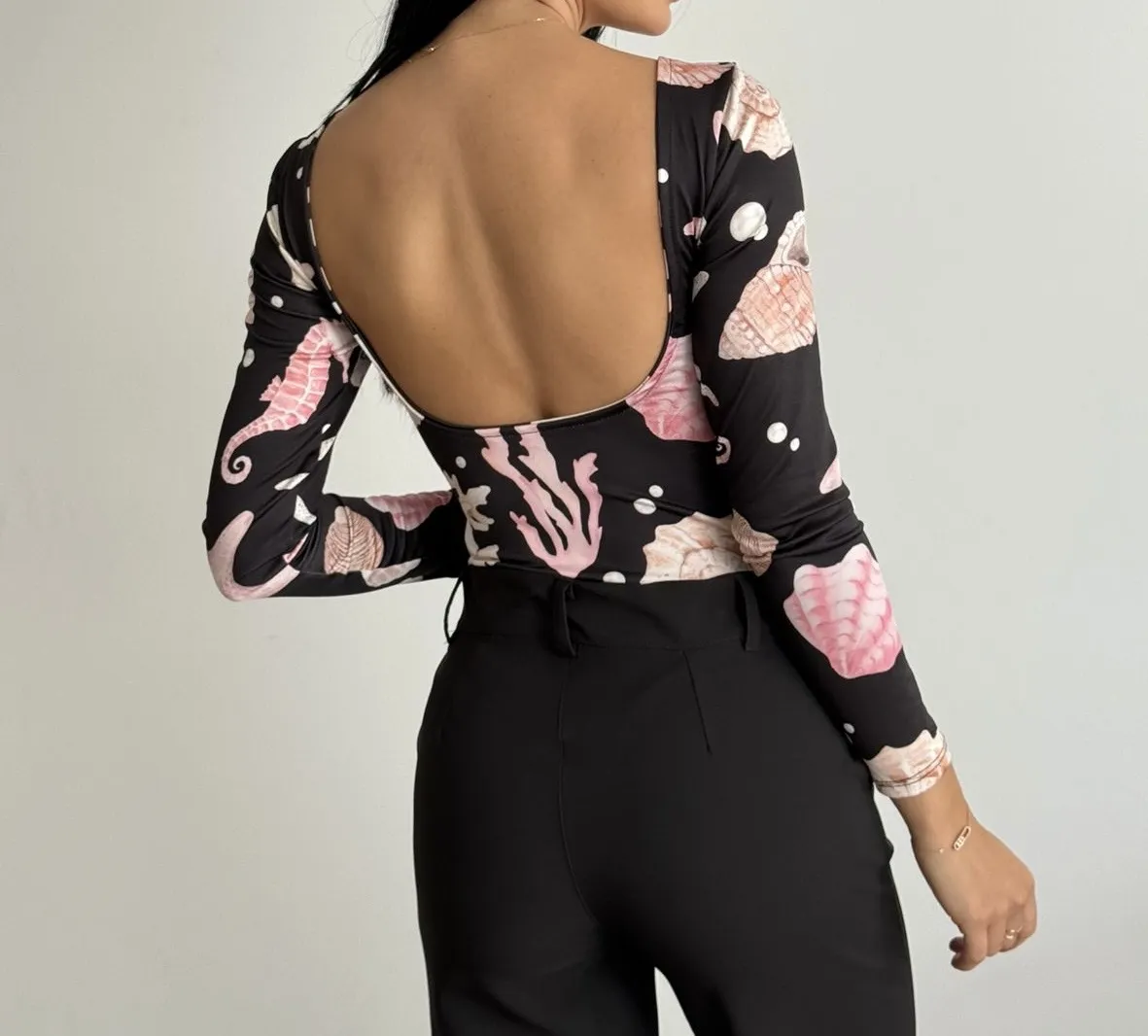 Lleva la esencia del océano con este body de manga larga y espectacular escote profundo en la espalda.