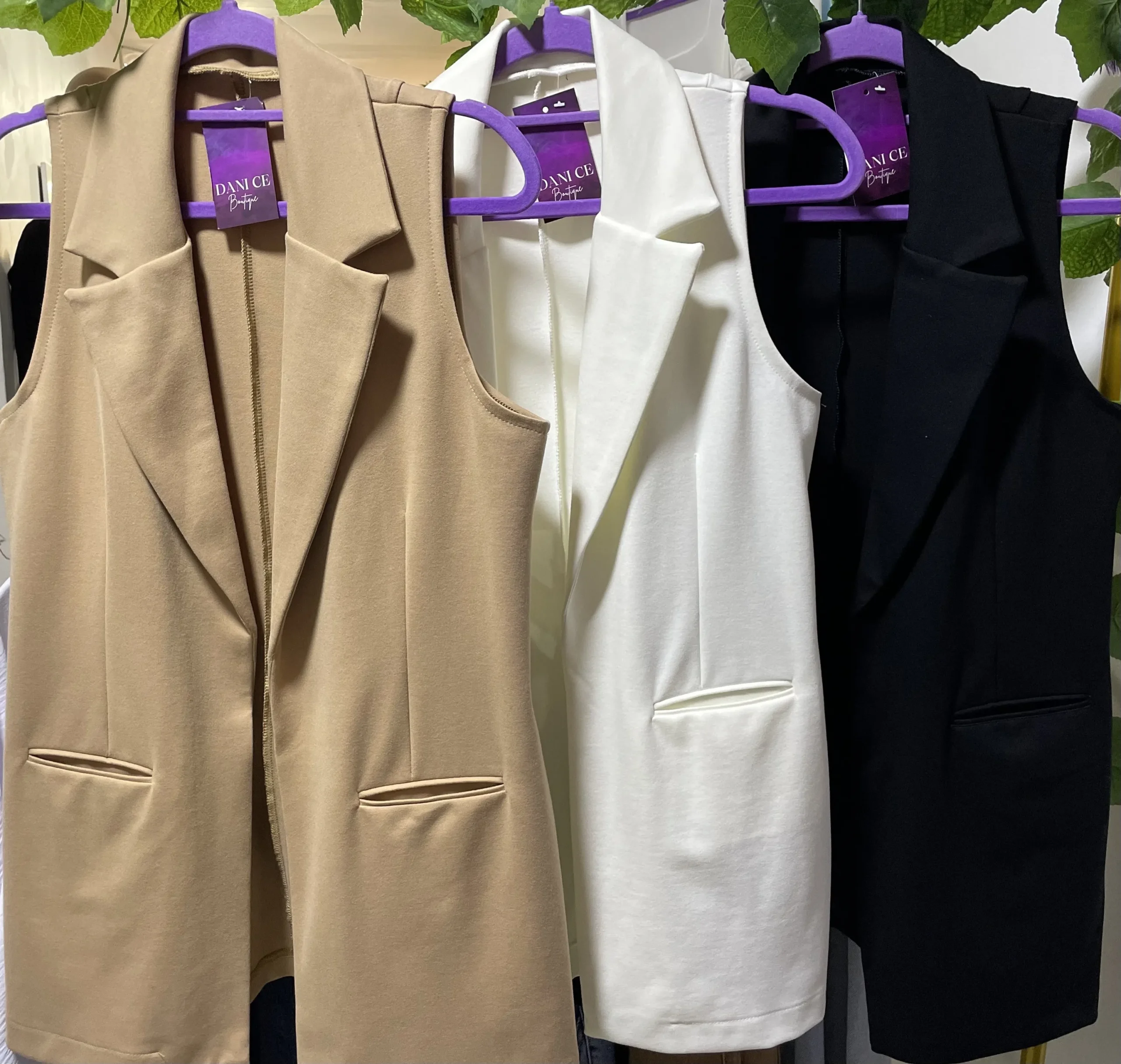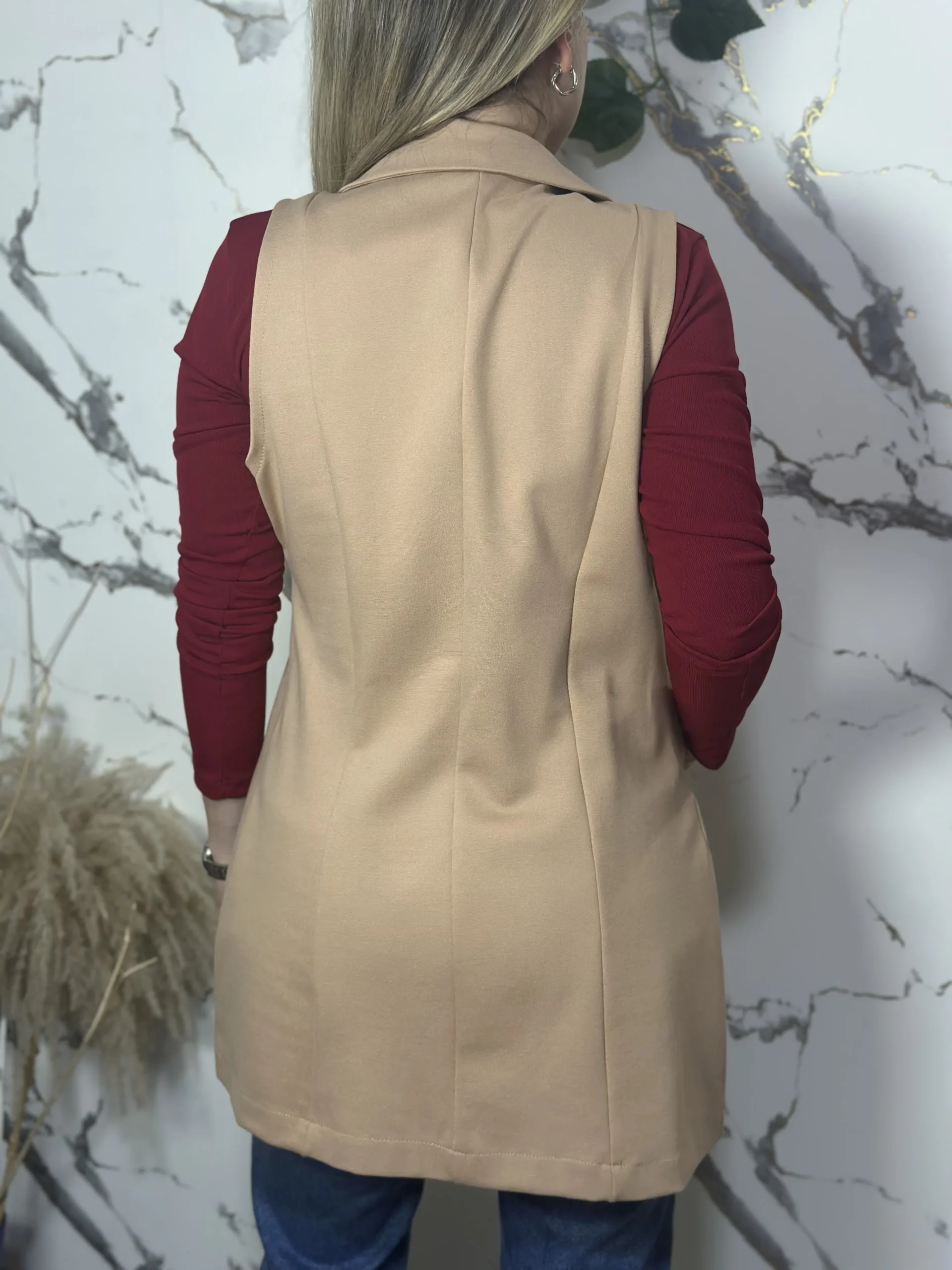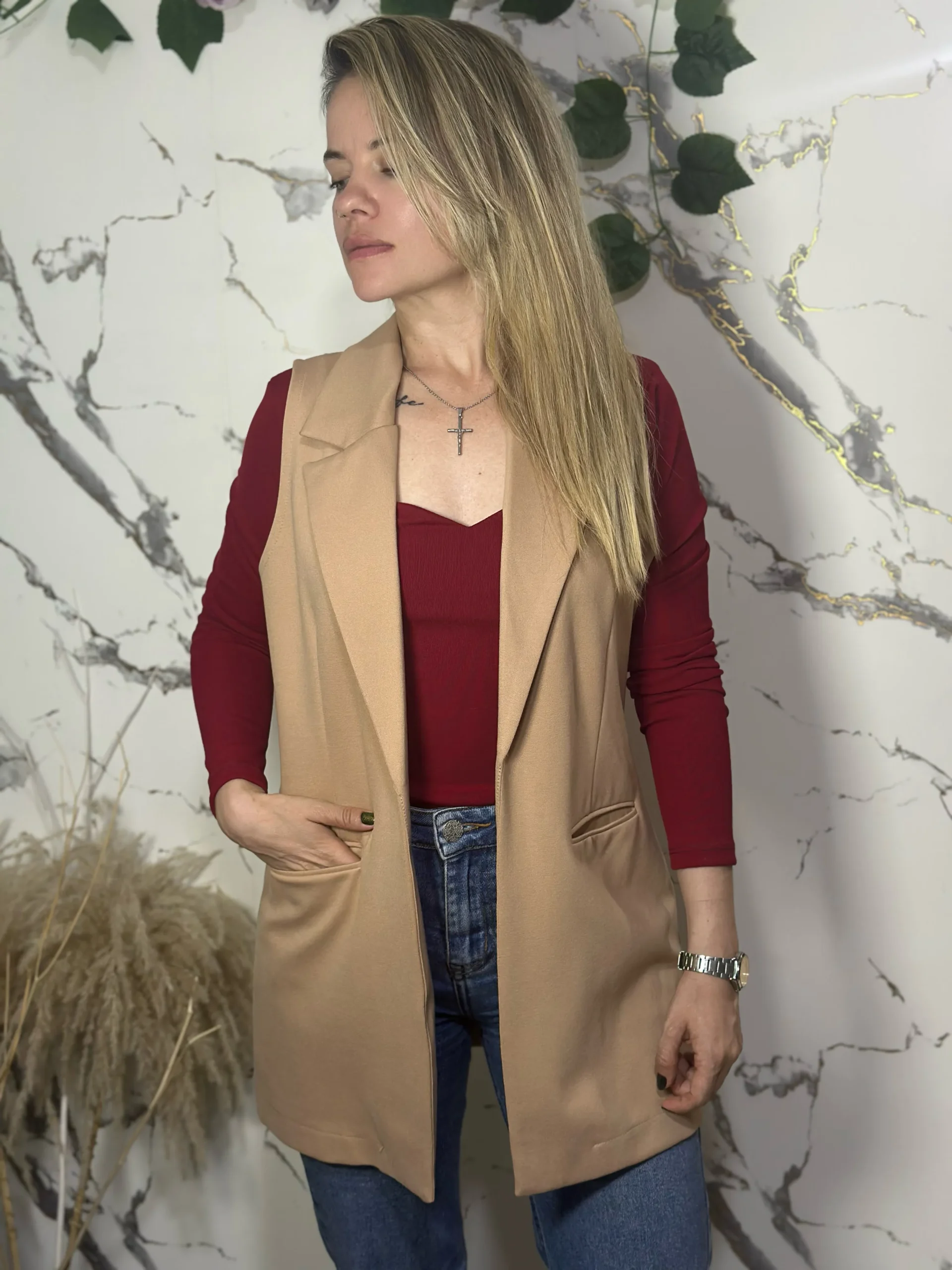Chaleco largo de punta Roma elástico, cómodo y elegante, ideal para un look moderno y sofisticado.