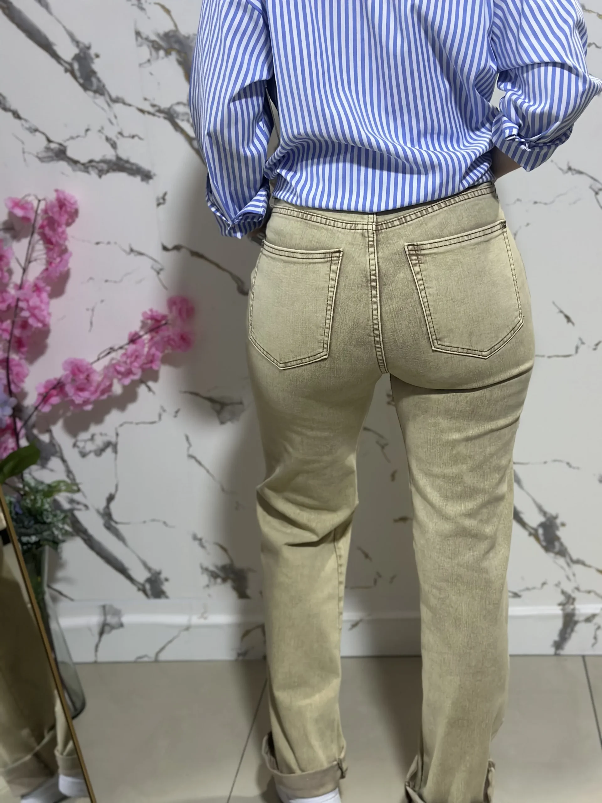 Jean color arena de tiro alto, cómodo y versátil, ideal para looks casuales con estilo moderno.