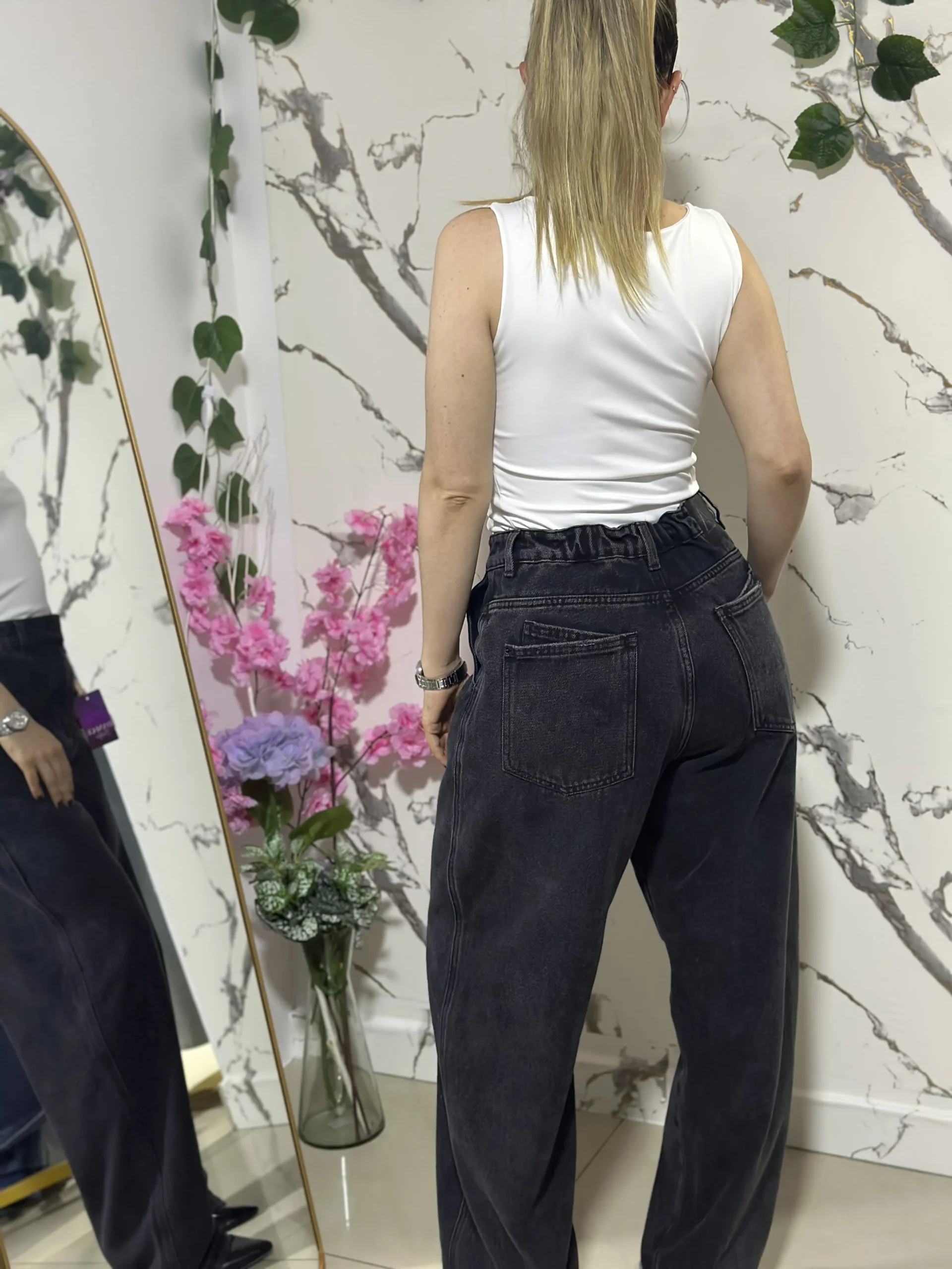 Jean baggy de tiro alto en denim rígido, con cintura elastizada trasera para mayor comodidad. Pierna amplia, Color gris oscuro y bolsillos funcionales.