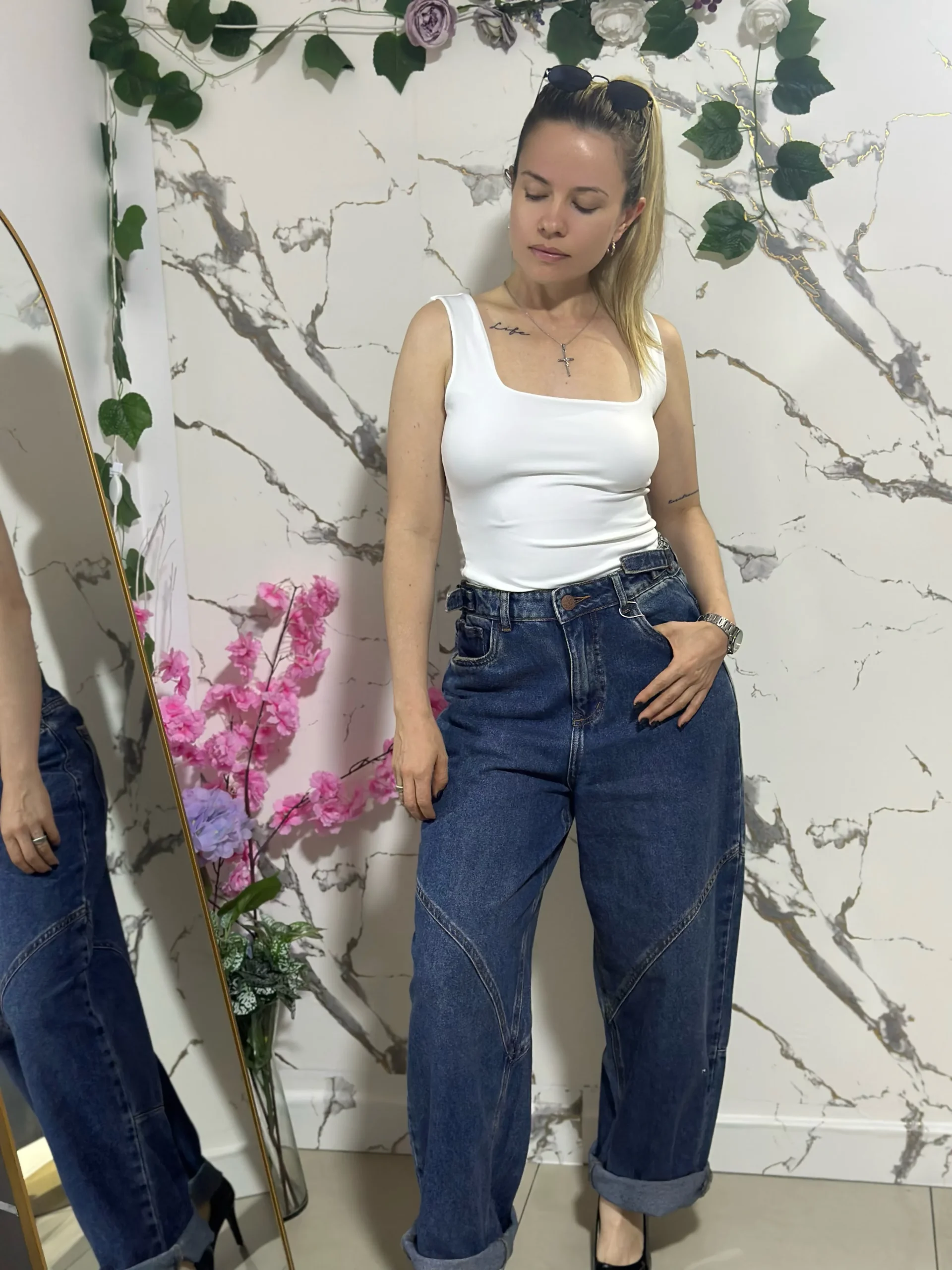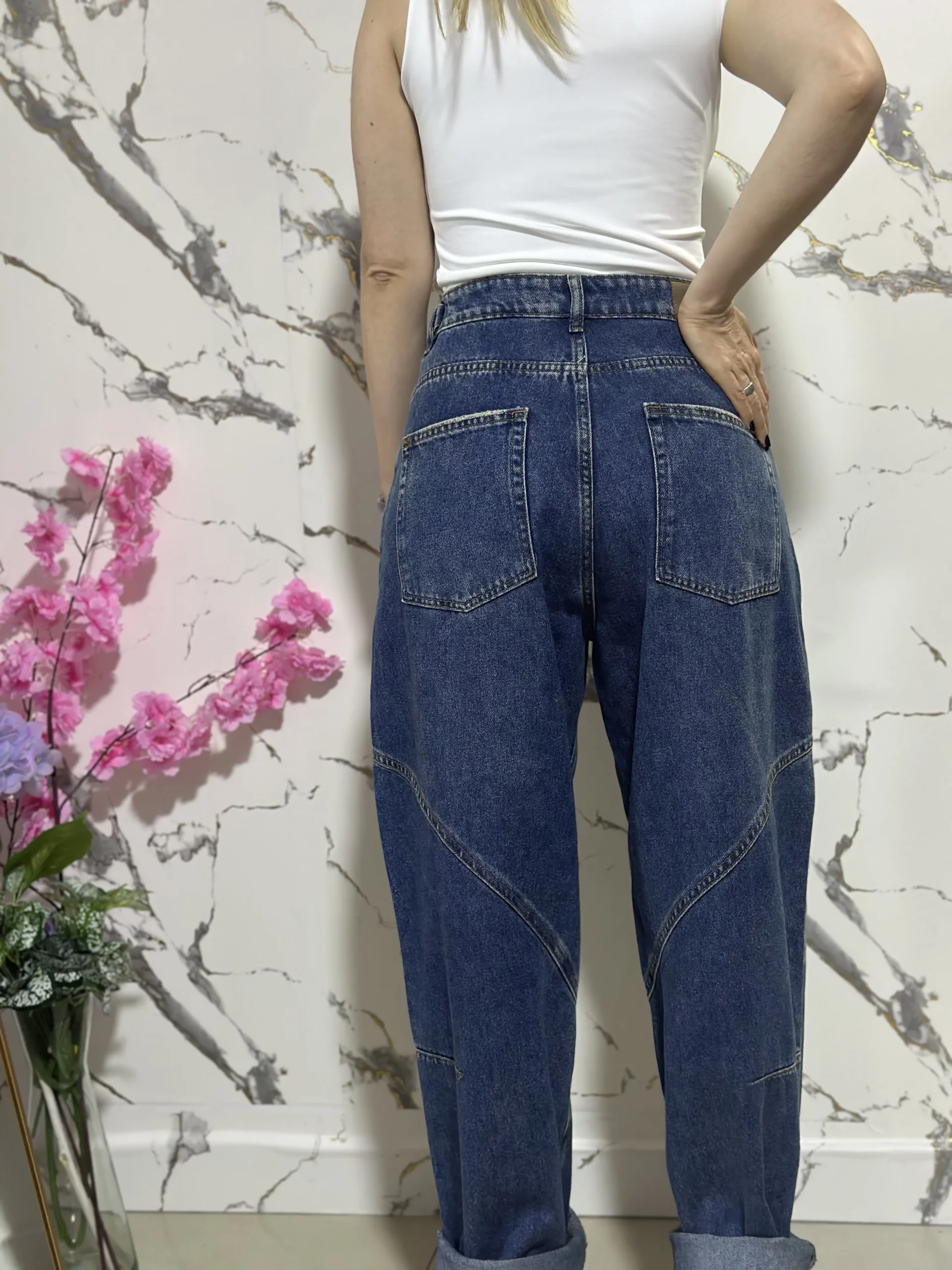 Jean rígido baggy azul de tiro alto, pierna ancha y costuras diagonales decorativas. Diseño vintage con bolsillos traseros cuadrados, ideal para un look casual y moderno.