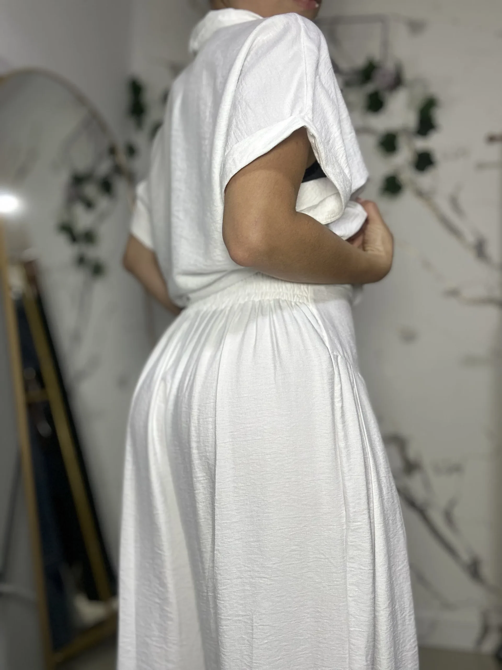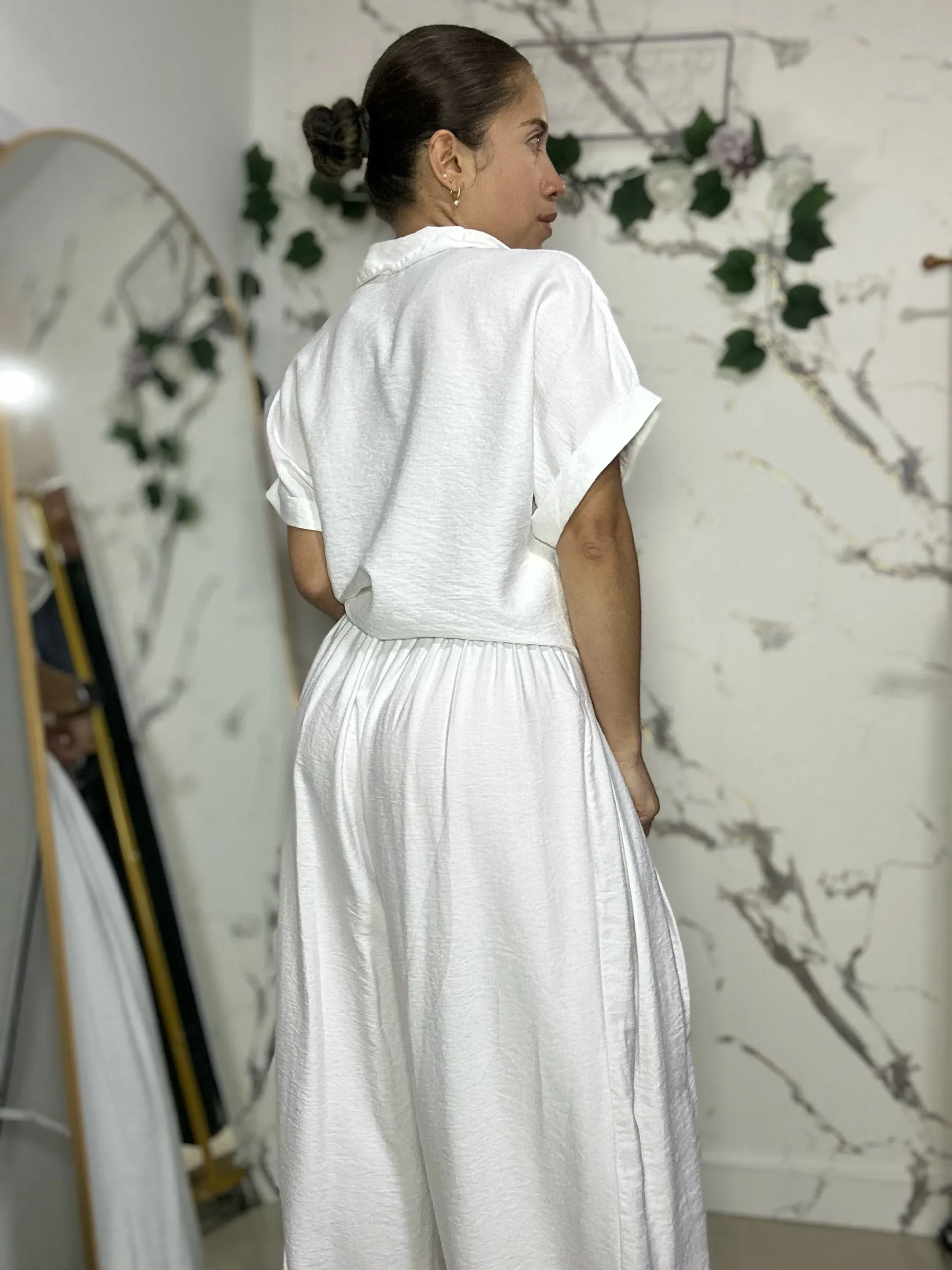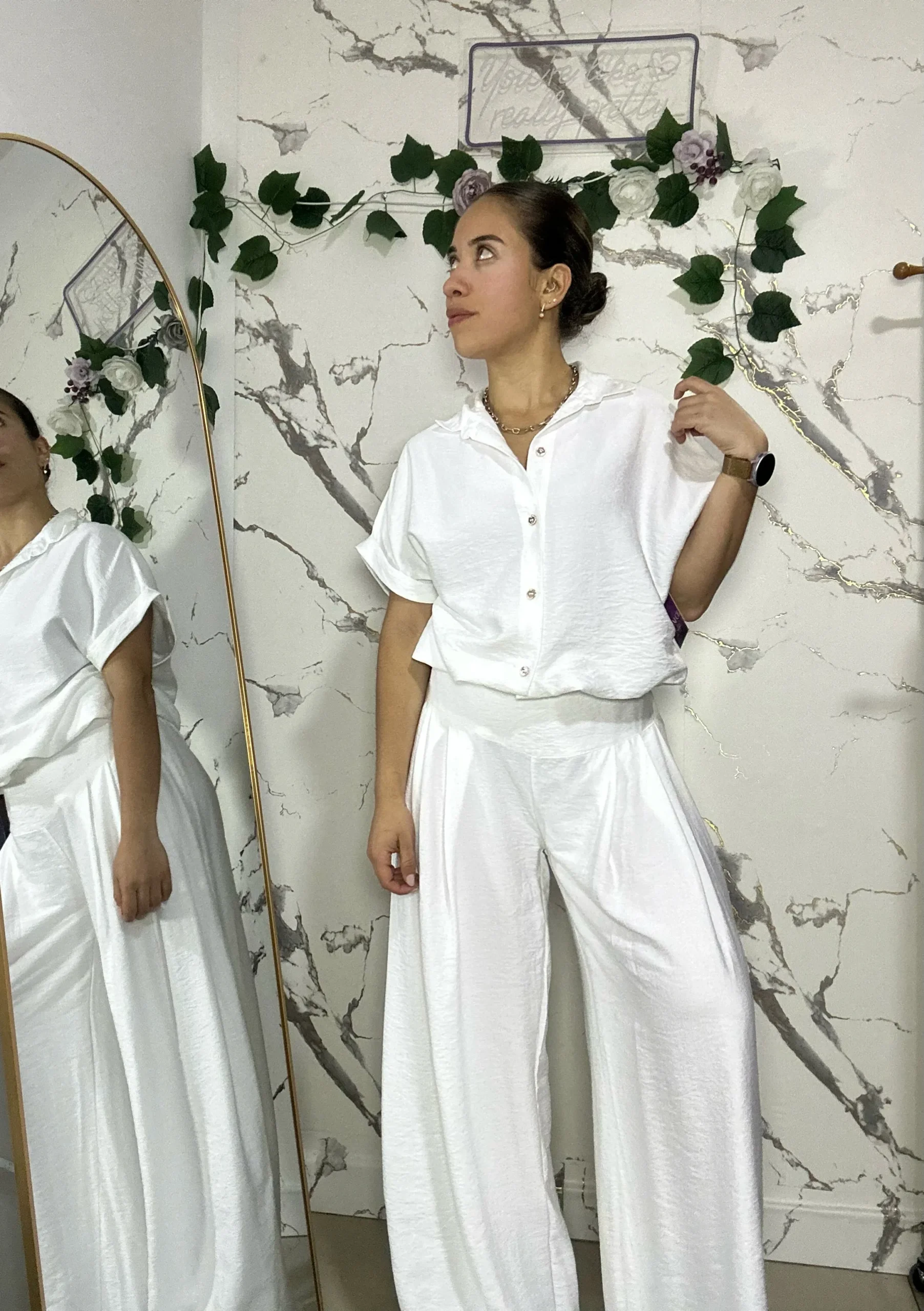 Set camisa y pantalón material rígido con elástico en cintura parte trasera camisa con parte inferior para amarrar.