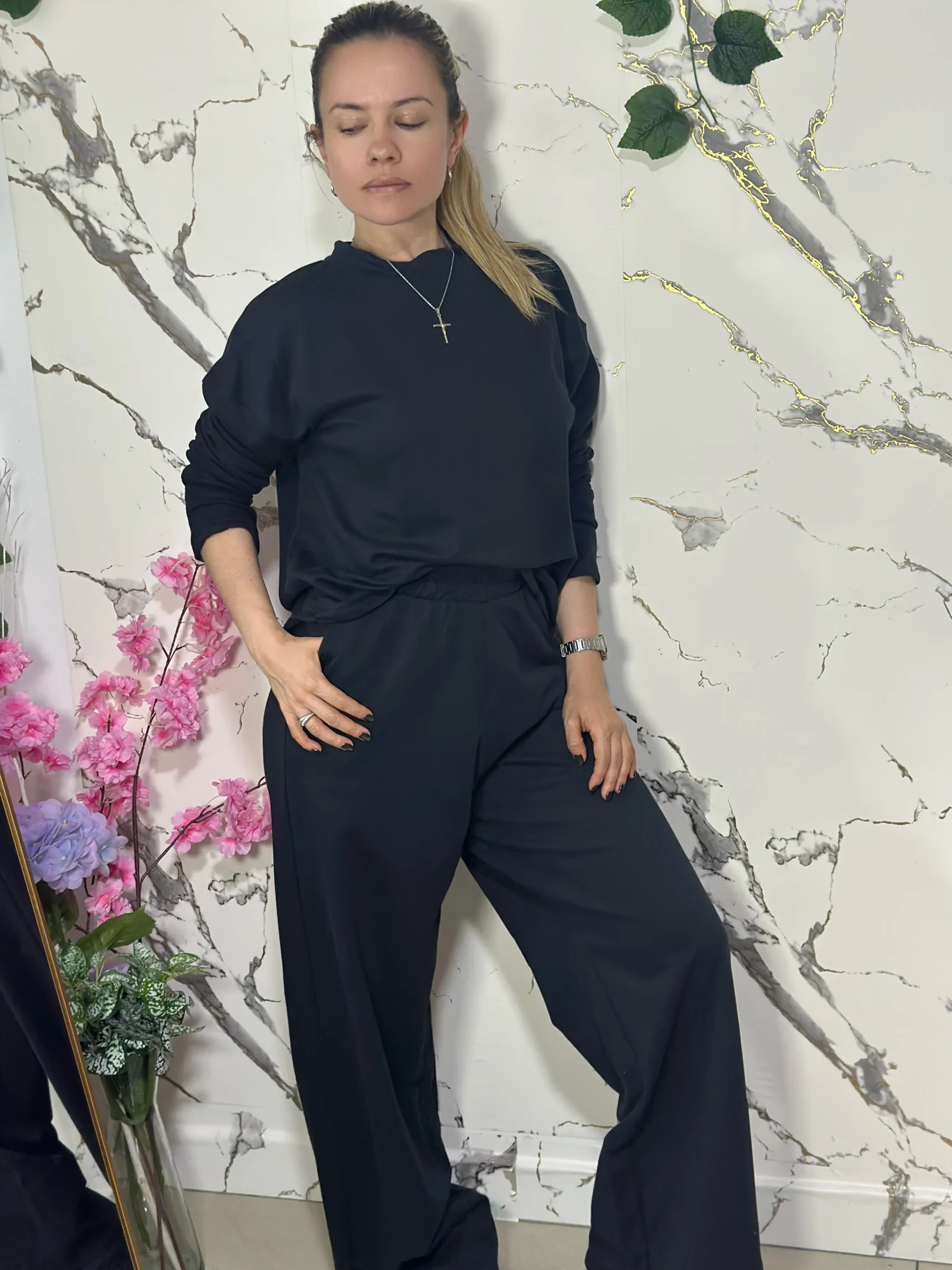Conjunto cómodo y suave. Diseño de corte relajado con pretina elástica.